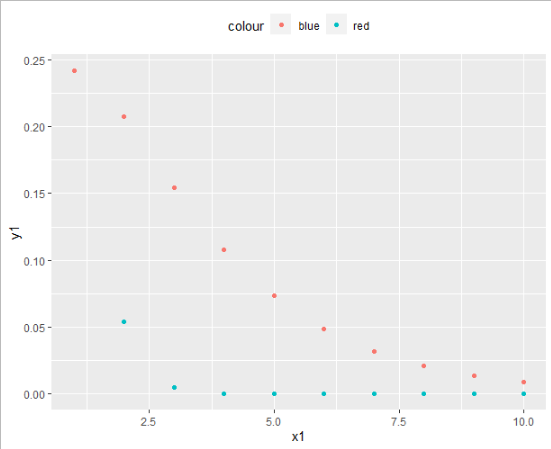 geom_point(data=data1, aes(x=x1,y=y1,color='red'))+