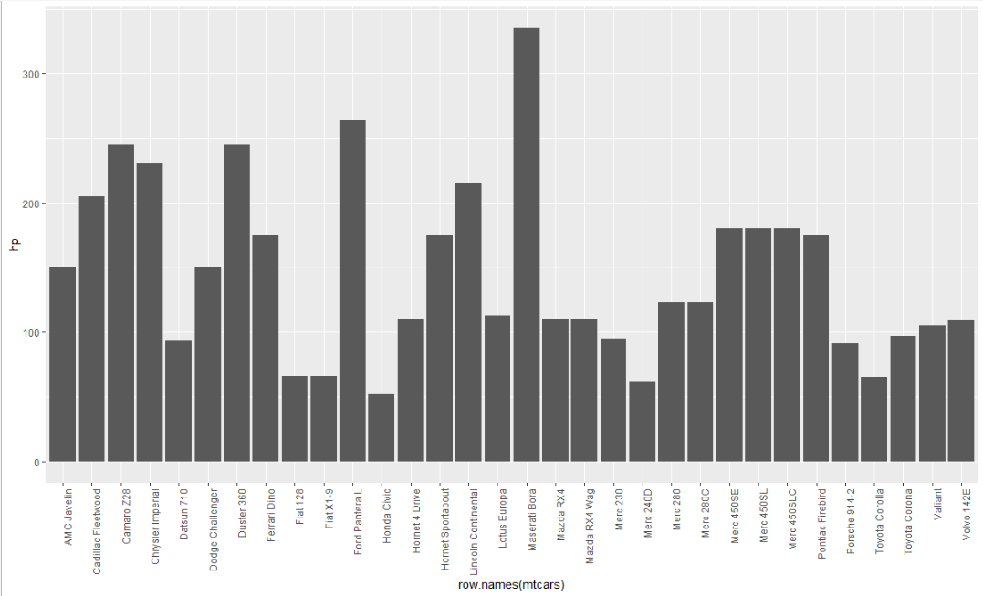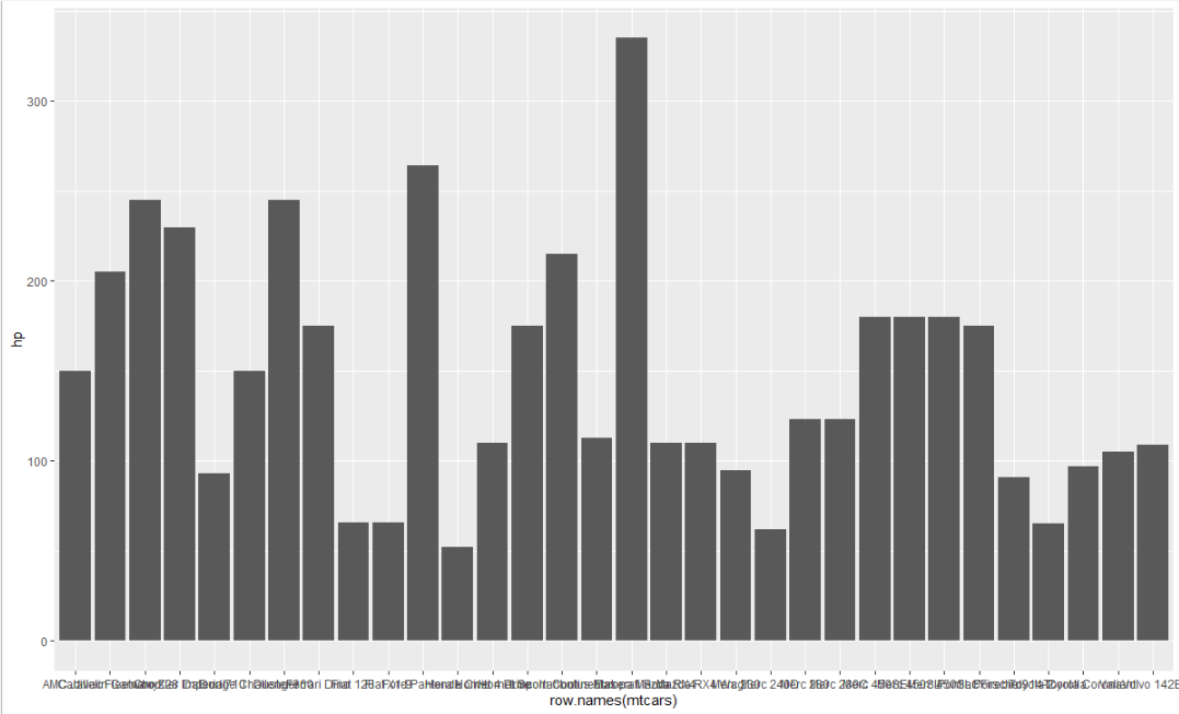32종류의 자동차 정보입니다. x축을 자동차 종류, y축을 hp 로 하여 막대 그래프를 그리면 아래와 같습니다. stat 을 identity 로 설정해야 막대그래프가 그려집니다.